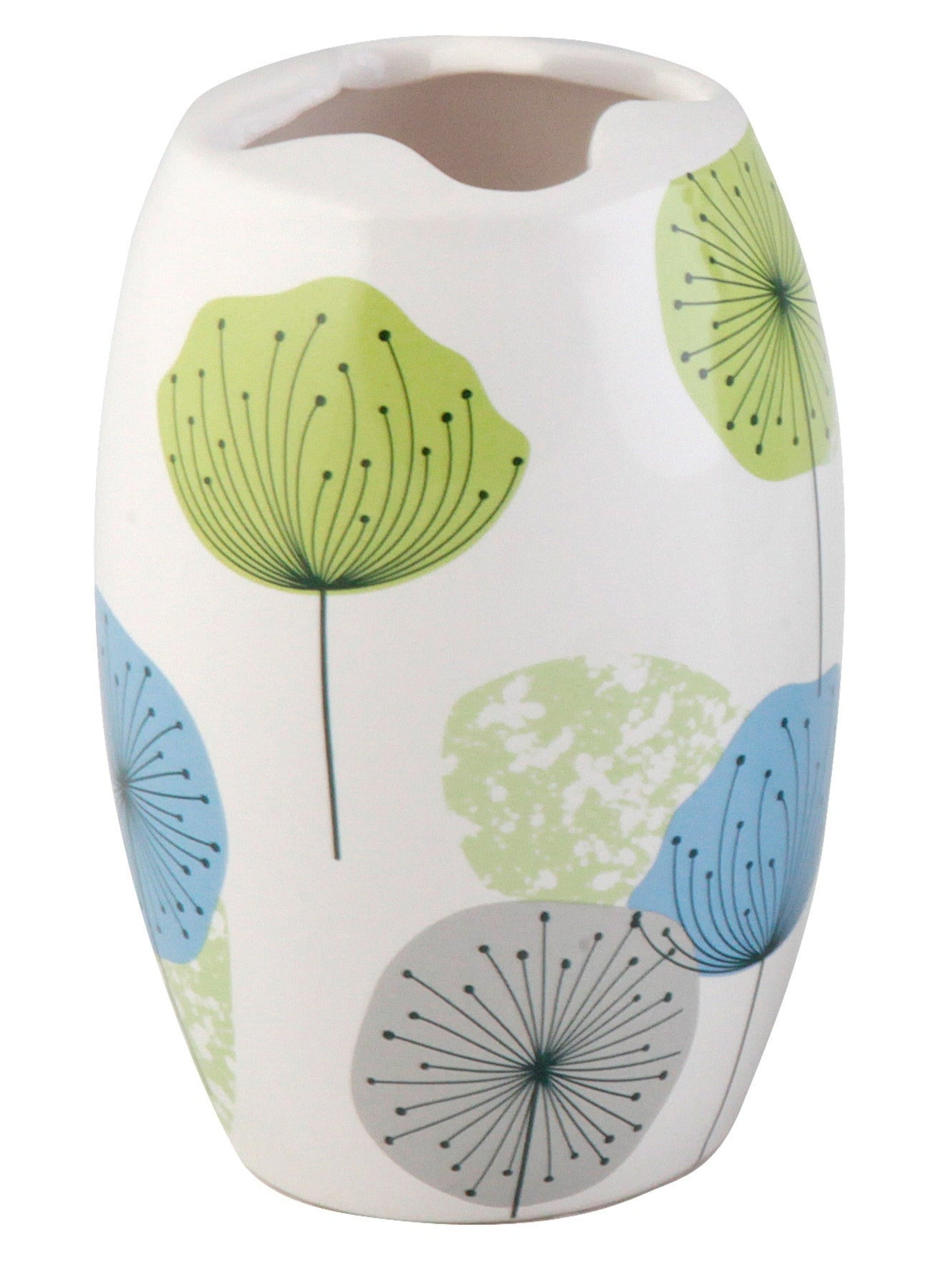 Suporturile pentru periuțe de baie din colecția Volare, realizate din ceramică albă cu motive florale în nuanțe de verde, gri și albastru, sunt obiecte de decor ce combină eleganța clasică cu un design rafinat.